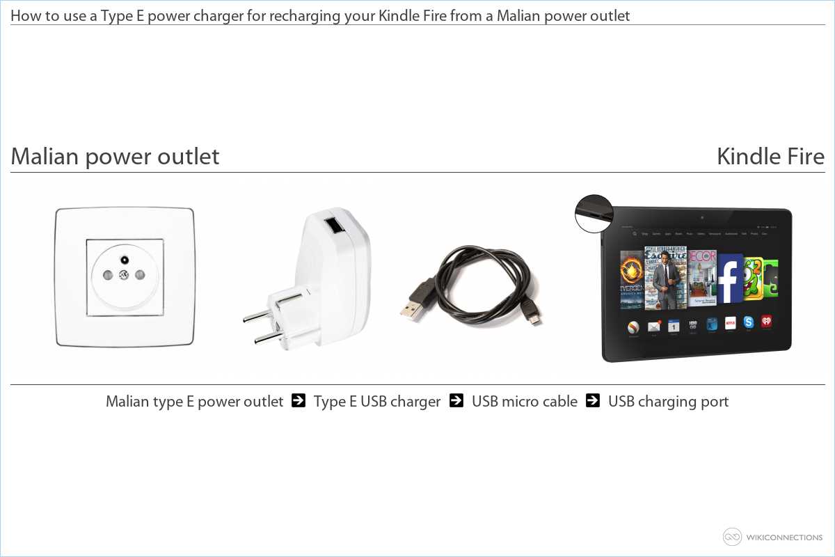 - If you want to power a Kindle Fire from a Malian power outlet you'll need to buy a Type E USB power plug adapter [7] and a USB 2.0 A Male to Micro B cable [5].