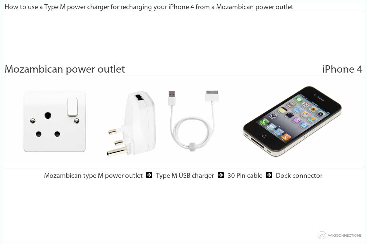 - In order to supply power to the iPhone 4 using the Mozambican power outlet you will need to use a Type M USB power plug adapter [9] and a USB to Apple 30 pin cable [5] (Apple should normally supply the cable with the iPhone 4).