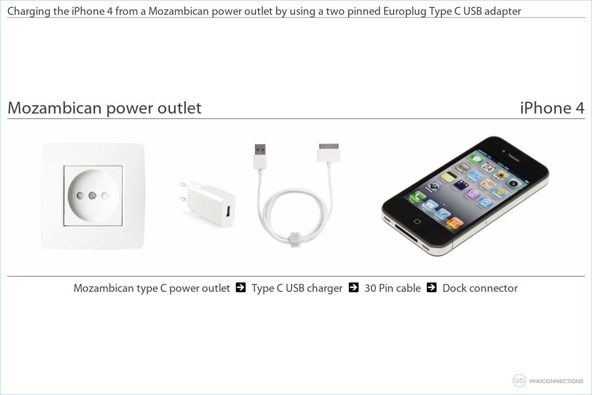 - If you want to power your iPhone 4 from a Mozambican power outlet you'll need to buy a Type C USB power plug adapter [4] and a USB to Apple 30 pin cable [5] - this USB cable is typically already included with the device by Apple.