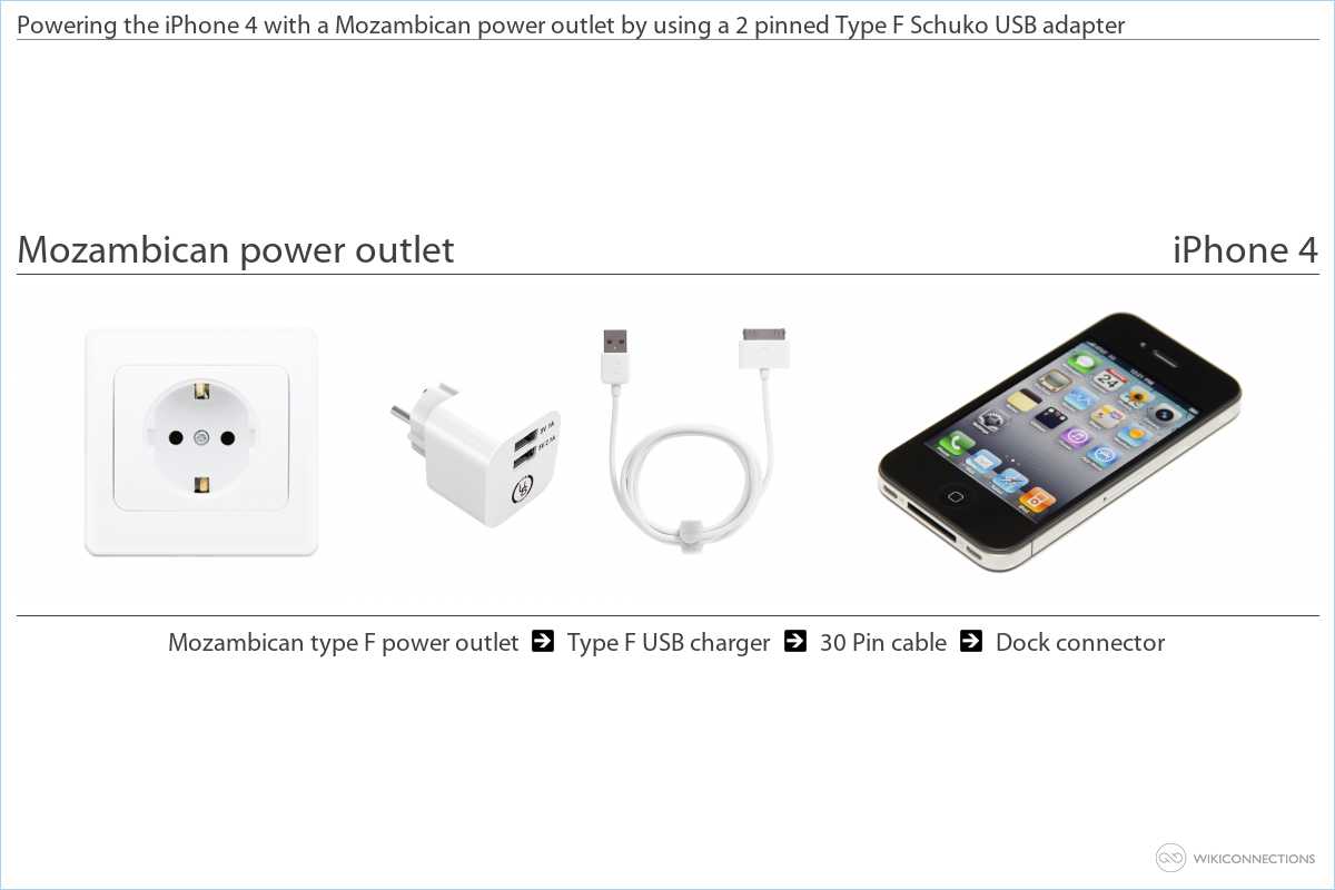 - To charge the iPhone 4 from a Mozambican power outlet you'll need a Type F USB power plug adapter [7] and a USB to Apple 30 pin cable [5] - this USB cable is normally already included with the device by Apple.