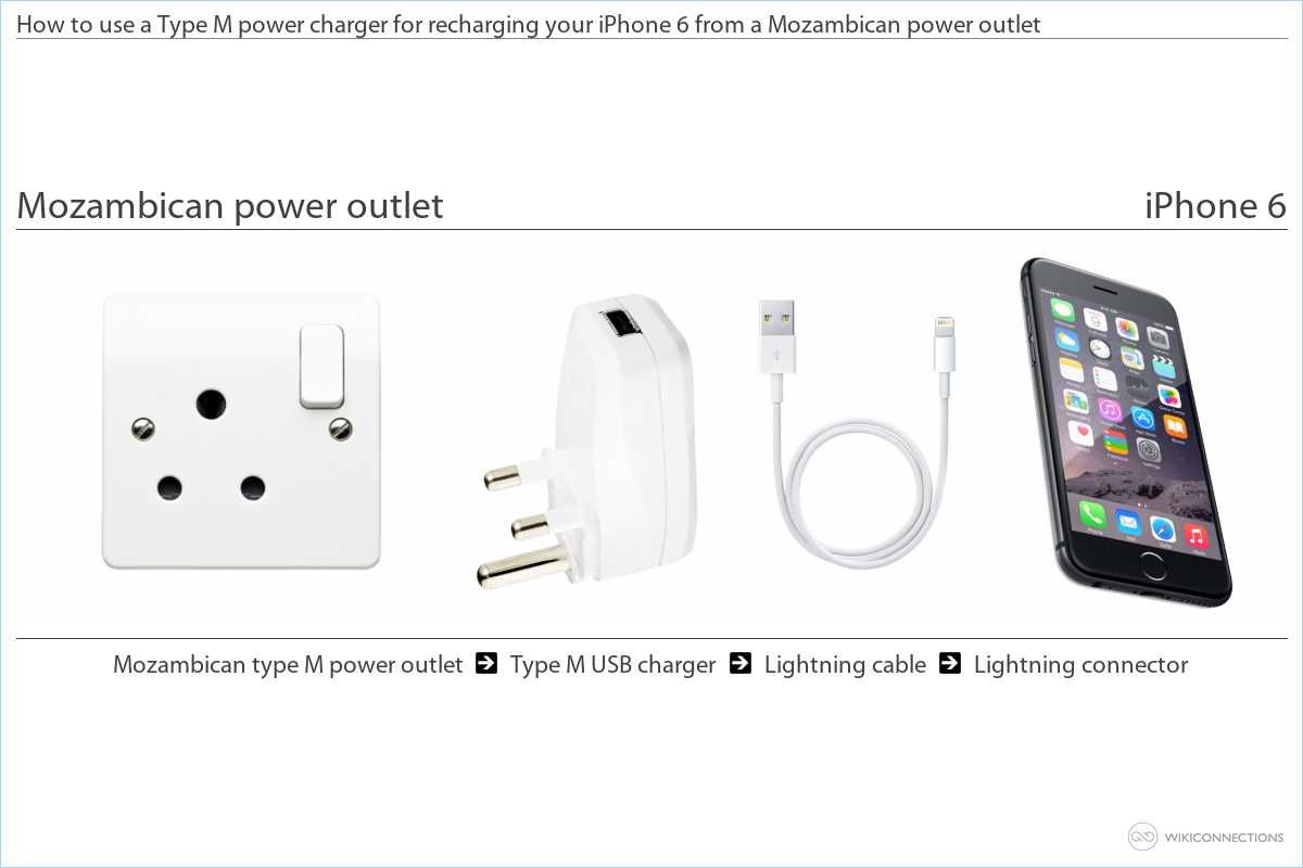 1. If you want to charge the iPhone 6 using a Mozambican power outlet you will need to use a Type M USB power plug adapter [9] and a USB to Apple Lightning cable [5] - Apple should usually include the USB cable when you first purchase your iPhone 6.