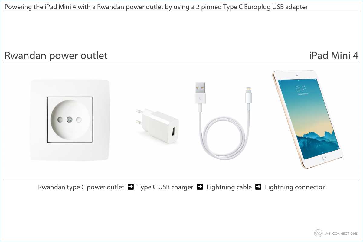 1. In order to power your iPad Mini 4 using a Rwandan power outlet you will need a Type C USB power plug adapter [4] and a USB to Apple Lightning cable [5] (the cable is usually already supplied with the device).