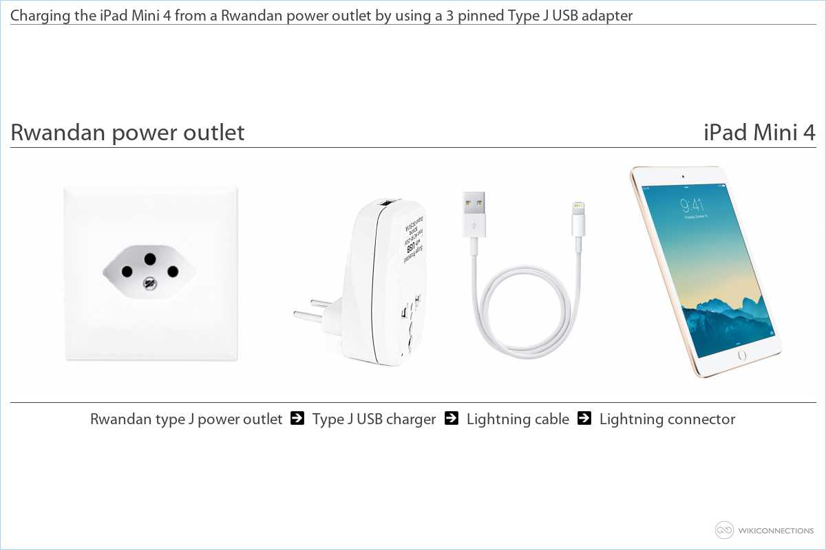A guide on how to power your iPad Mini 4 from a Rwandan power outlet with a USB Lightning connector and a Type J power adapter.