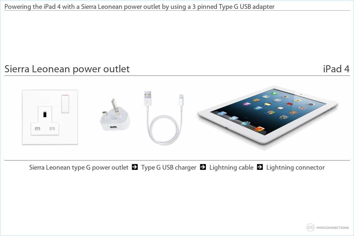 1. In order to supply power to the iPad 4 from the Sierra Leonean power outlet you will need to buy a Type D USB power plug adapter [7] and a USB to Apple Lightning cable [5], Apple should typically include this cable when you buy the iPad 4.