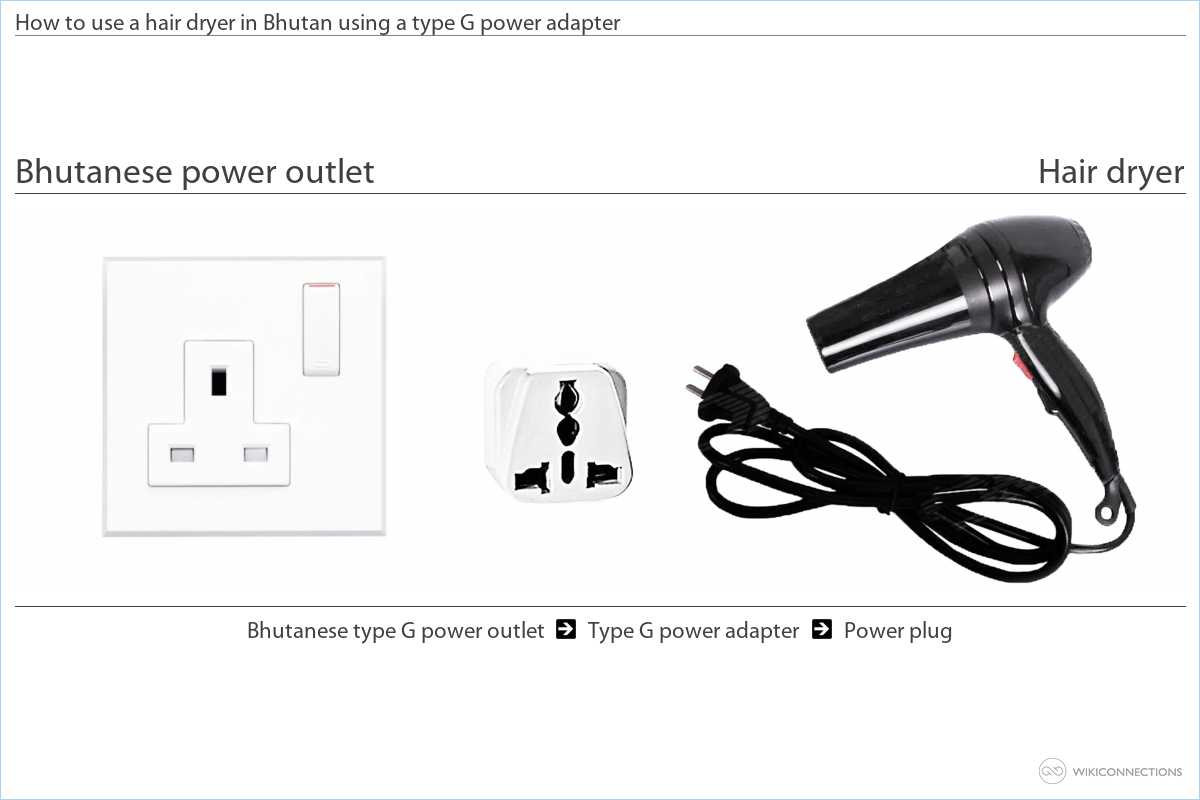 - You will need to use a Type G power adapter [10] if the type of plug used on your hair dryer isn't the same shape as the power outlet which is used in Bhutan. The power adapter is designed to convert different plugs on appliances from other countries for an electrical outlet found in Bhutan simply by changing the shape of the plug, but the adapter doesn't change the frequency or voltage of the hair dryer to work with a 230 volt outlet.