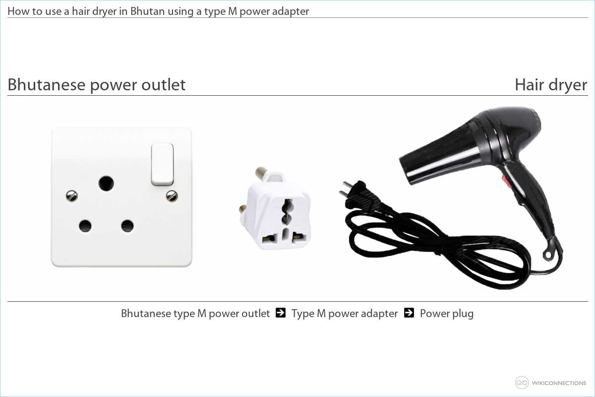 - If the type of power outlet used in Bhutan won't accomodate the plug shape on your hair dryer you'll need to bring a Type M power adapter [12]. This plug adapter will help adapt plugs from other countries for use with a power outlet in Bhutan simply by changing the shape of the plug, however it doesn't change the voltage of the hair dryer to work with a 230 volt supply.