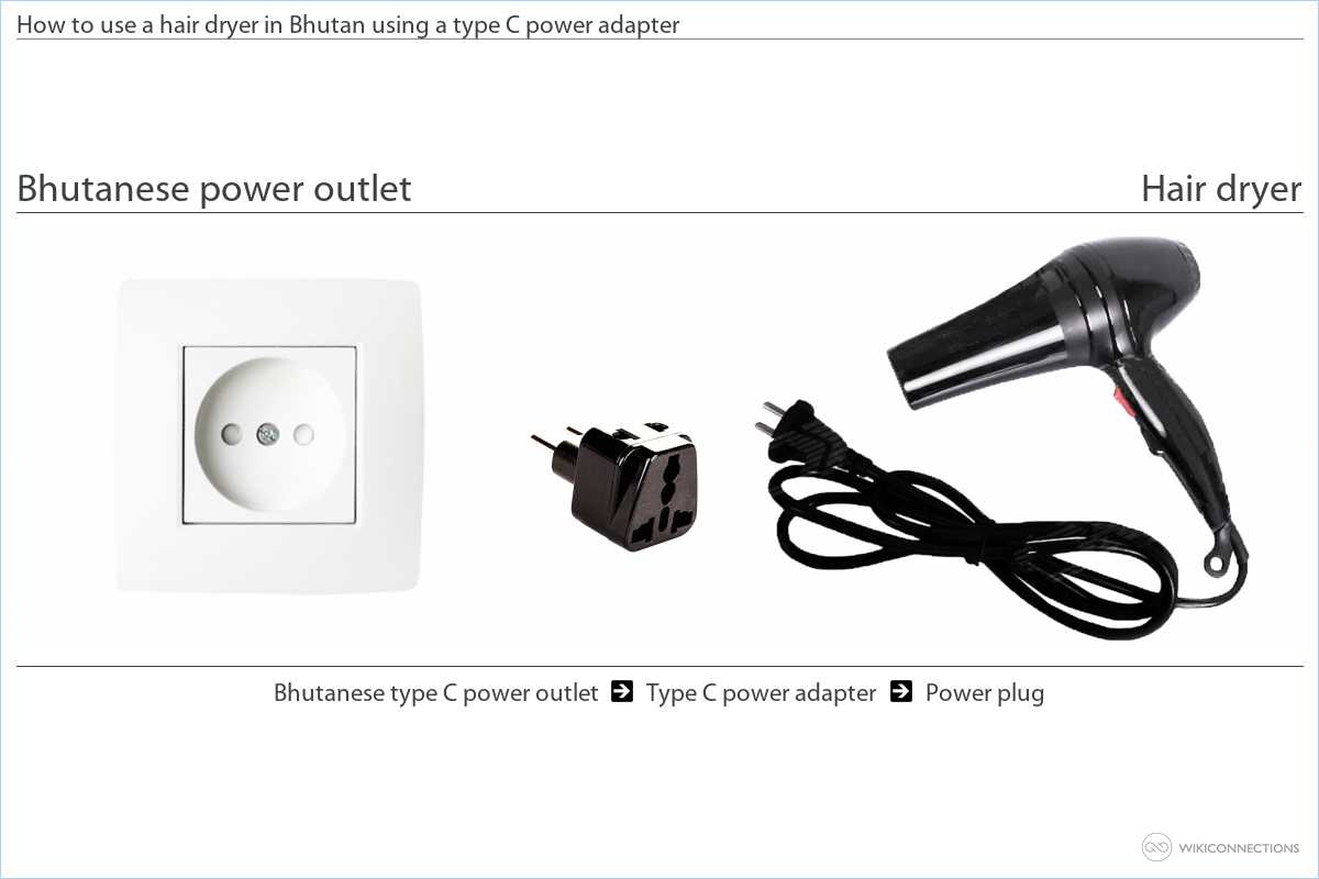 - You will need to buy a Type C power adapter [4] if the shape of the power outlet which is used in Bhutan isn't the same shape as the plug on your hair dryer. This plug adapter will help fit plugs from other countries into a power outlet in Bhutan simply by changing the shape of the plug, however it doesn't change the voltage of the hair dryer to work with a 230 volt outlet.