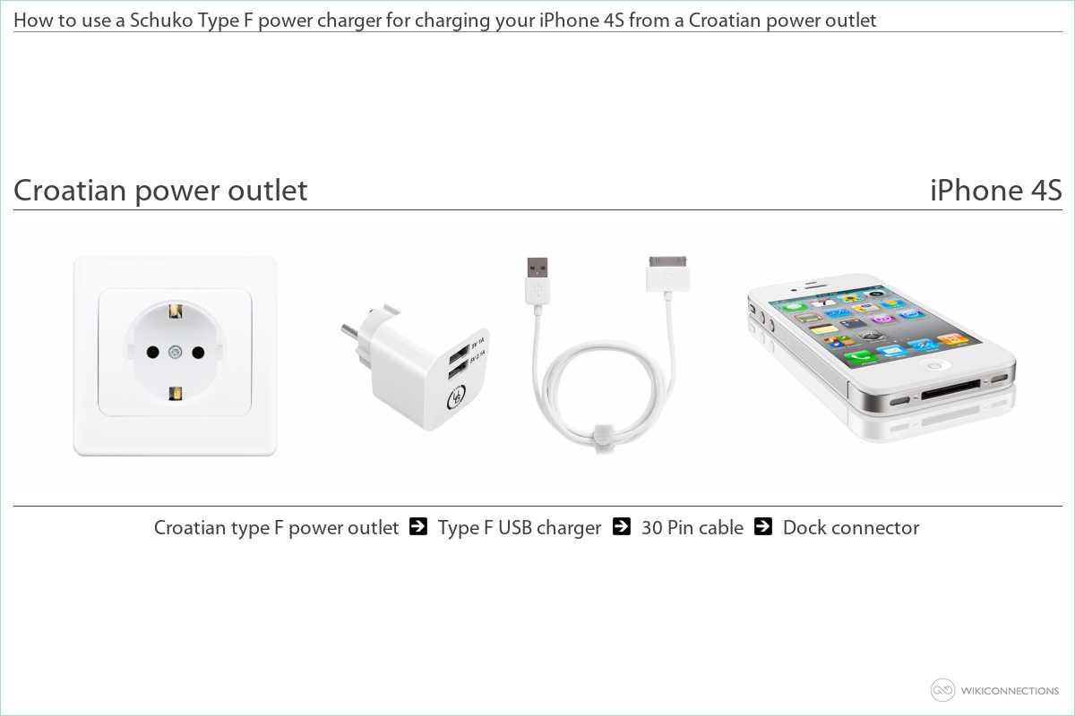 - To supply power to the iPhone 4S using the Croatian power outlet you'll need to use a Type F USB power plug adapter [7] and a USB to Apple 30 pin cable [5] (normally included with your iPhone 4S by Apple).