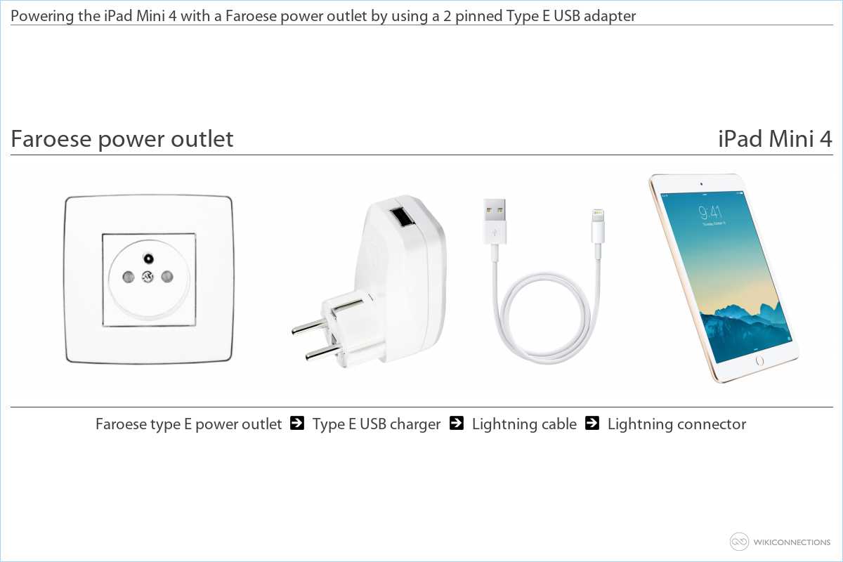 - In order to supply power to your iPad Mini 4 from the Faroese power outlet you will need to buy a Type E USB power plug adapter [7] and a USB to Apple Lightning cable [5] (usually already included with your iPad Mini 4).