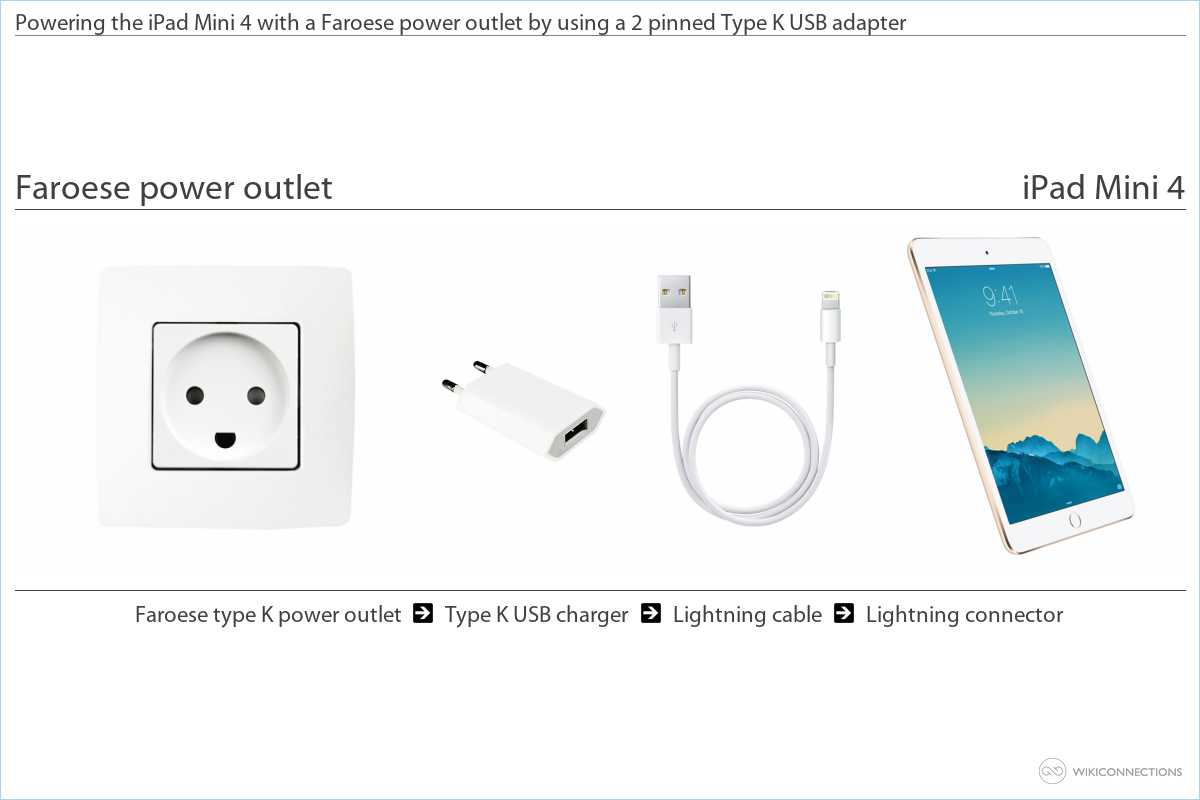 - To power the iPad Mini 4 from a Faroese power outlet you'll need to use a Type K USB power plug adapter [11] and a USB to Apple Lightning cable [5] (Apple should usually include the cable when you buy the iPad Mini 4).