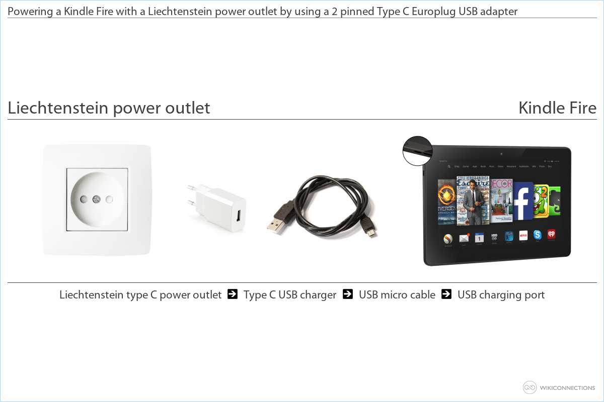 - To supply power to your Kindle Fire from the Liechtenstein power outlet you will need a Type C USB power plug adapter [4] and a USB 2.0 A Male to Micro B cable [5].