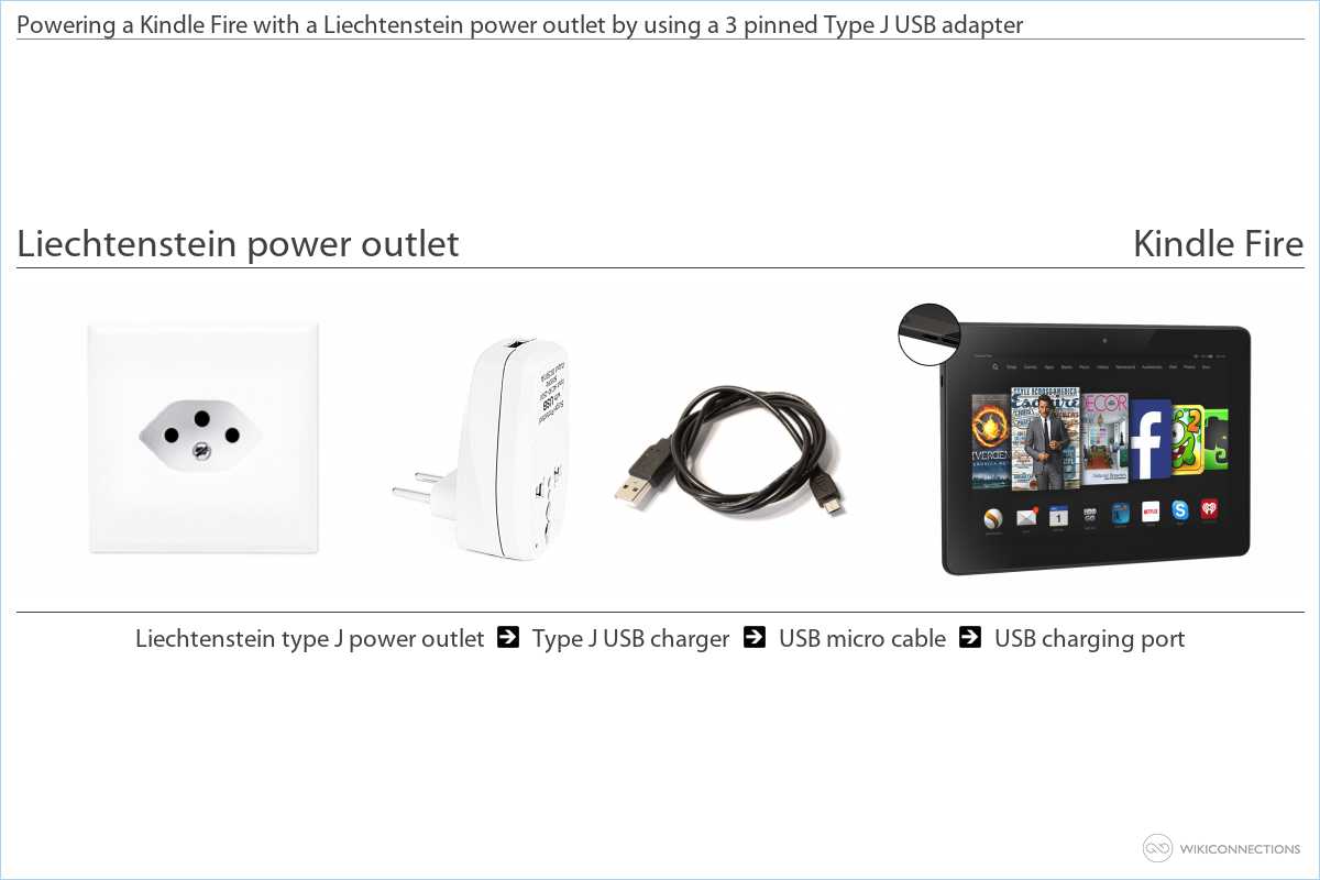 - If you want to supply power to a Kindle Fire using the Liechtenstein power outlet you'll need to buy a Type J USB power plug adapter [7] and a USB 2.0 A Male to Micro B cable [5].