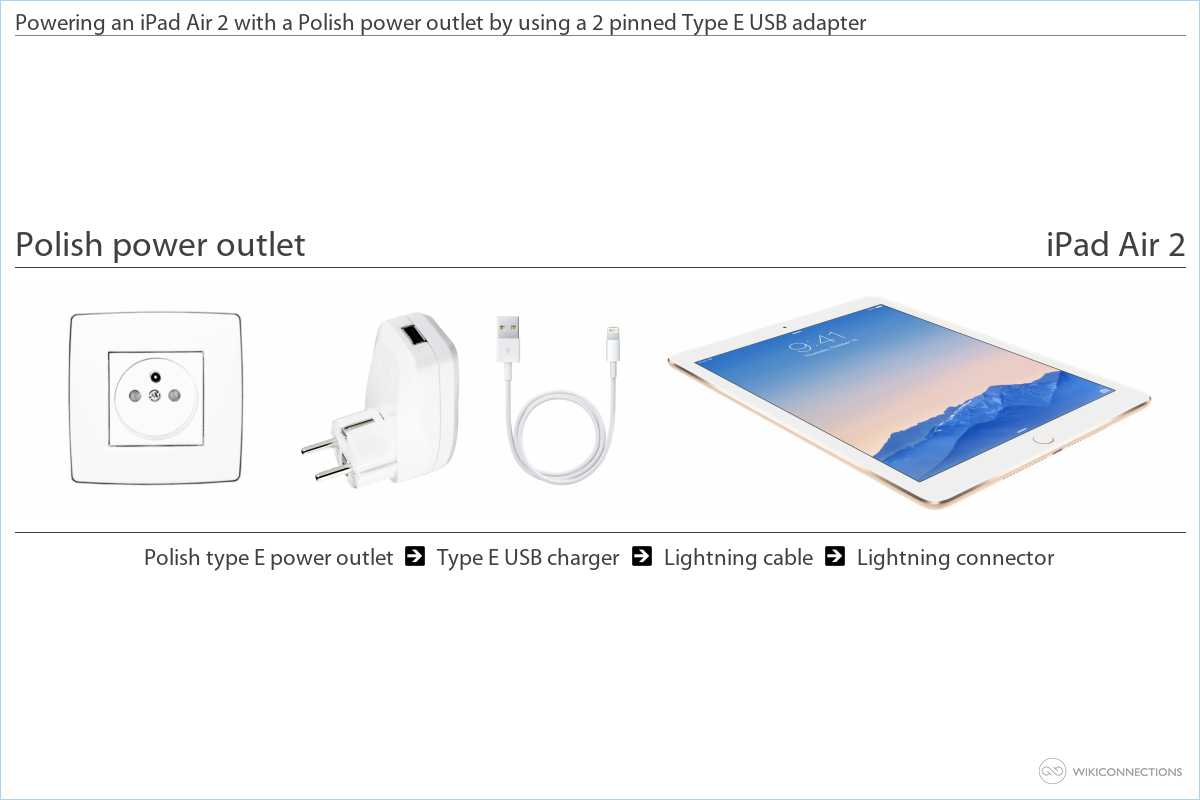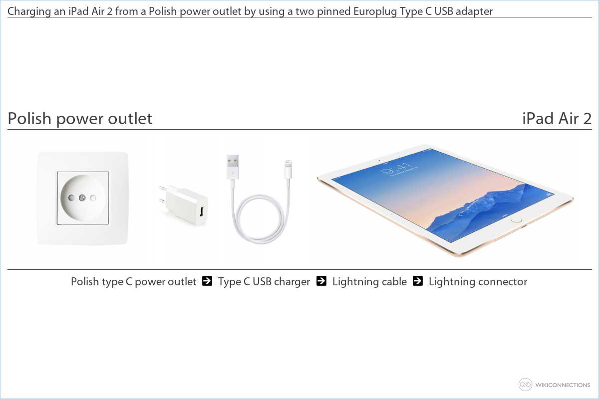 1. To charge an iPad Air 2 from a Polish power outlet you'll need a Type C USB power plug adapter [4] and a USB to Apple Lightning cable [5], usually supplied with your iPad Air 2.