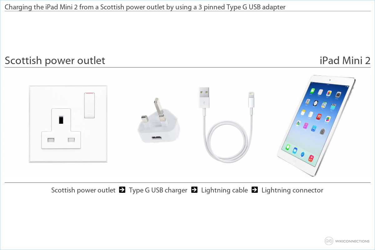 1. If you want to charge the iPad Mini 2 from the Scottish power outlet you'll need to use a Type G USB power plug adapter [4] and a USB to Apple Lightning cable [5] - Apple should usually supply this cable with your iPad Mini 2.