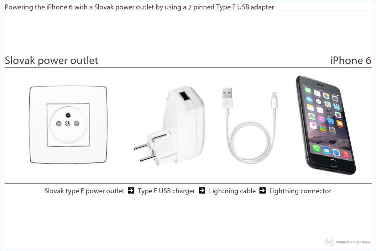 - If you want to supply power to your iPhone 6 from the Slovak power outlet you will need a Type E USB power plug adapter [7] and a USB to Apple Lightning cable [5] - the cable is usually included with your iPhone 6 by Apple.