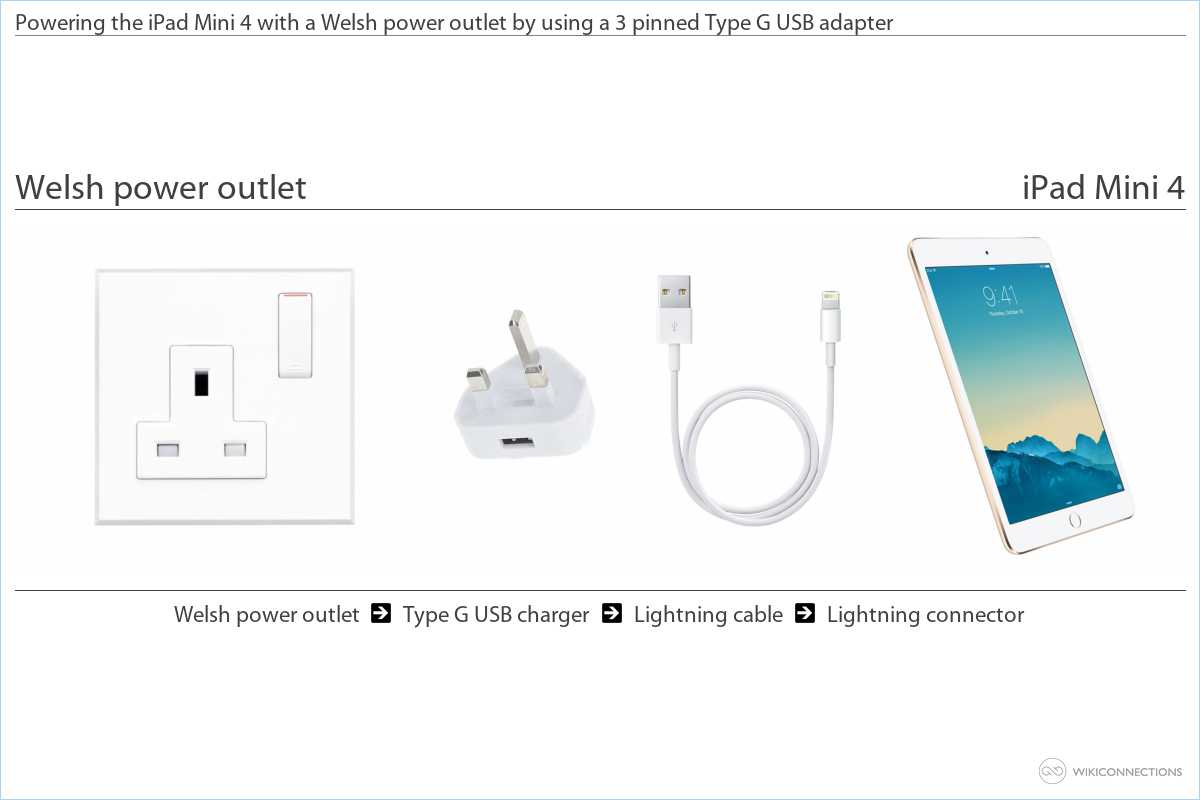 - In order to supply power to the iPad Mini 4 from the Welsh power outlet you'll need a Type G USB power plug adapter [4] and a USB to Apple Lightning cable [5], Apple will normally include this cable when you buy the iPad Mini 4.