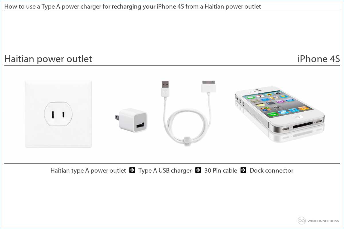 - If you want to charge your iPhone 4S using the Haitian power outlet you'll need to buy a Type A USB power plug adapter [4] and a USB to Apple 30 pin cable [5], Apple normally supply this USB cable when you purchase your iPhone 4S.
